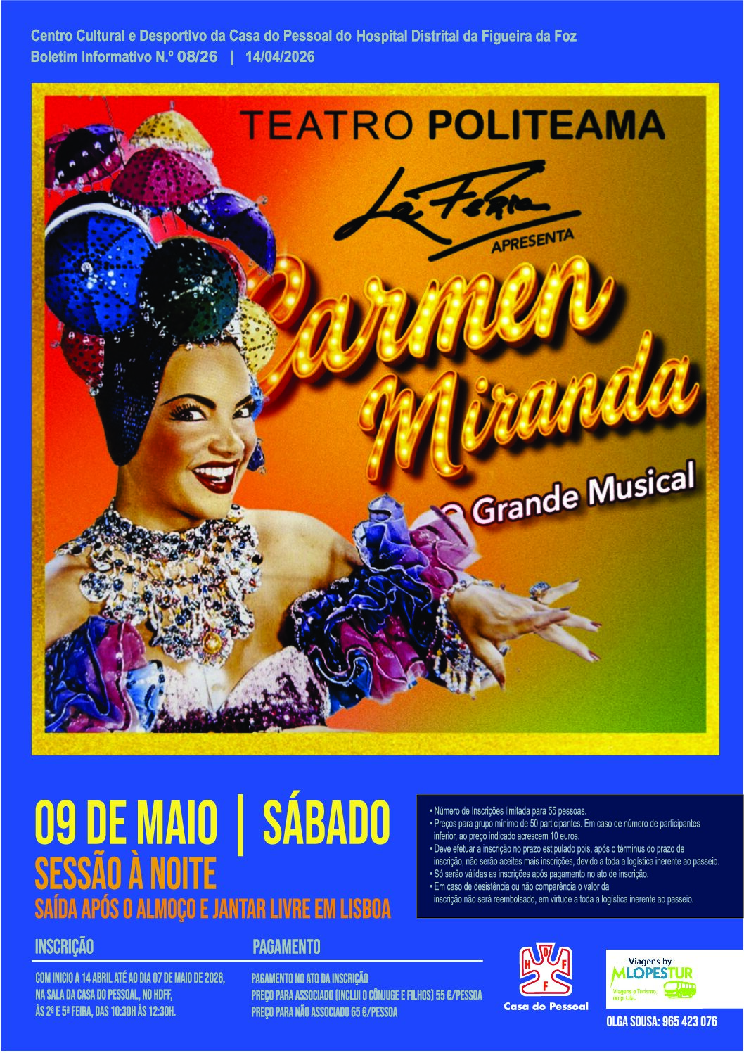 A Direção do Centro Cultural e Desportivo da Casa do Pessoal, informa que as inscrições, estarão abertas a partir de amanhã dia 14 de Abril, para o Grande Musical “Carmen Miranda” de Filipe La Féria, no Teatro Politeama.